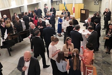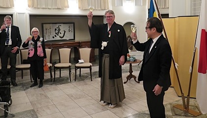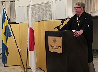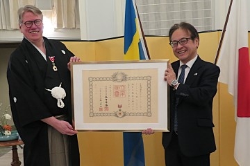 2月10日、大使公邸にて、グンナル・儘盟・リンデル ストックホルム大学准教授兼尺八奏者に対する旭日小綬章の叙勲伝達式が開催されました。冒頭、カーリン・ベックストローム氏が指導する合唱団Stockholms Unga Rösterが両国国歌を披露しました。水越大使による開会の挨拶ののち、リンデル准教授の恩師であるグニッラ・リンドベリ・ワダ ストックホルム大学名誉教授が祝辞にてリンデル准教授の功績を称え、その後勲章と勲記の授与が行われました。リンデル准教授は答辞において、受章の喜び及びお世話になった方々への感謝の意を表するとともに、世阿弥の「初心忘るべからず」を引用しつつ、今後も、尺八奏者や准教授としての活動に尽力する決意を述べました。