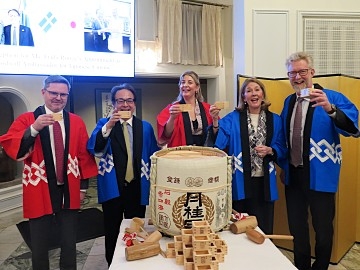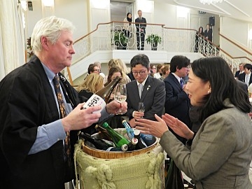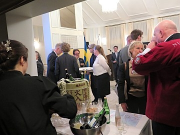 ロンゲ氏の今後の活躍を願って、日本の伝統的な鏡開きが行われた後、ビジネス・スウェーデンのヤン・ラーション・ビジネススウェーデンCEOによる乾杯のご発声により開催された祝賀レセプションにおいては、久保田公邸料理人による日本食の提供のほか、ロンゲ氏が所属するストロベリー系列のレストランにおいて、大阪万博で提供された北欧–日本のフュージョンメニューが提供されました。その他、日本酒インポーターによる試飲・プロモーション、日本食材販売店による日本食品の展示、日本式スパ旅館による温泉PRブースも設置され、出席者は多彩な日本の味や文化を楽しんでいました。