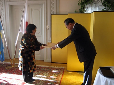 Den 27 oktober 2010 ägde en ceremoni rum på Japans ambassadörs residens för Hiroko Kimura. Hon fick ta emot Japans utrikesministers utmärkelse för att hon främjar japansk kultur i Sverige. Under ceremonin överlämnade ambassadör Watanabe ett diplom och en liten gåva. I sitt tacktal nämnde Hiroko Kimura, som är verksam som kalligraf och konstnär, att det inte bara är hennes egen förtjänst att hon kan ta emot detta pris, utan att det är tack vare stödet och hjälpen från många andra genom åren. Hon nämnde också att hon även i fortsättningen vill vara en brobyggare för japansk kultur. Alla som var med vid ceremonin delade Hiroko Kimuras glädje över denna utmärkelse.