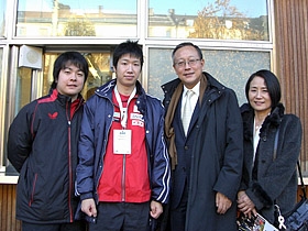 Spelarna Seiya Kishikawa och Jun Mizutani med ambassadörsparet.