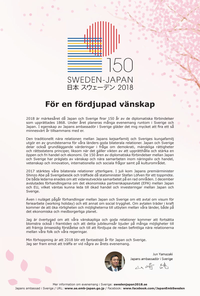 Ambassadör Yamazakis hälsning med anledning av 150-årsjubileet av etablerandet av diplomatiska förbindelser mellan Japan och Sverige publicerades i Svenska Dagbladet söndag den 11 mars, fredag den 16 mars och söndag den 18 mars.
