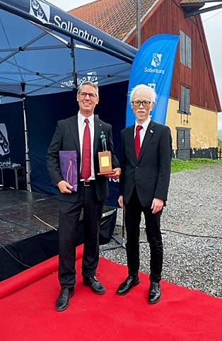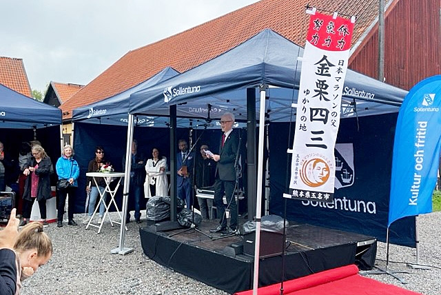 Ambassadör Noke presenterar Kanakuri-trofén från staden Tamana i Kumamotos prefektur (Kanakuris födelseplats) till Sollentunas borgmästare.